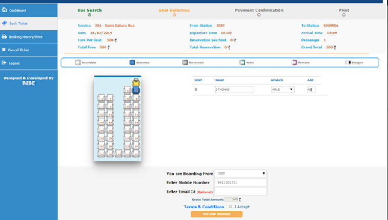 Step 6.) Select the seat(s) from the Bus Layout (as per the Image) and Enter the Details(Name, Gender and Age) of the Traveller(s), Accept the Terms and Conditions and Click on "Pay And Proceed" Button.